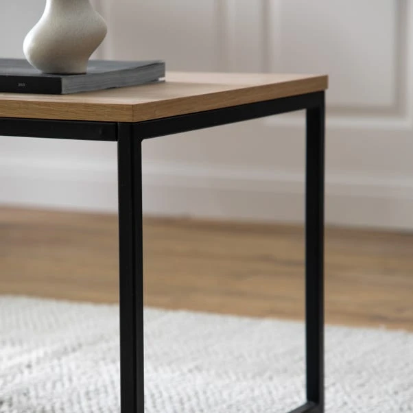 With a oak veneer top and a matt black metal frame, this coffee table will look great in your home. You can decorate it to your choosing to really help make your living space shine. Full assembly is required, but do not worry! Assembly is easy and all the tools you will need are supplied. Coordinating furniture pieces are available in the Indio range.