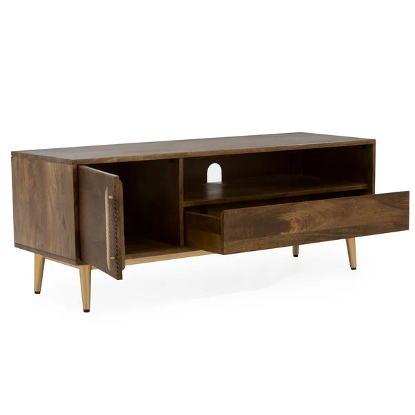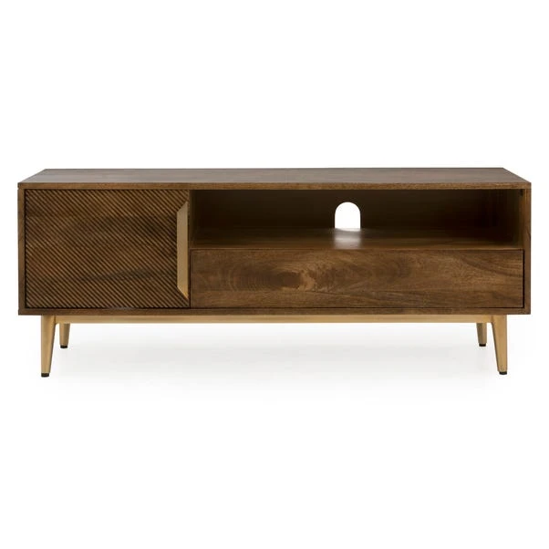Complete with a spacious cupboard and single, wide drawer, the gorgeous Anya TV stand offers plenty of convenient storage and features a wide shelf with a handy cable aperture. Featuring a carved detailing on the door and brass finished, geometric handle, this fully assembled TV stand is sure to bring a luxurious look to your living room.