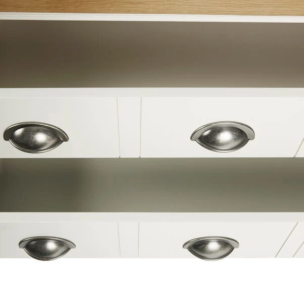 Inspired by clean and simplistic styling with a natural look that will compliment a host of interiors, the charming Compton range features natural solid oak and thick oak veneer tops accompanied with an elegant ivory painted finish. Crafted with classic antique silver cup handles, this range is designed with solid pine wood legs.