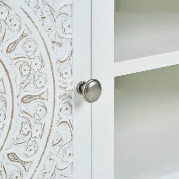 Finished in a white colourway, the Samira Corner TV Unit features two spacious fixed shelves, as well as additional storage space behind the decoratively carved door. This unit is perfect for fitting into compact spaces, so you can make the most of your living room.