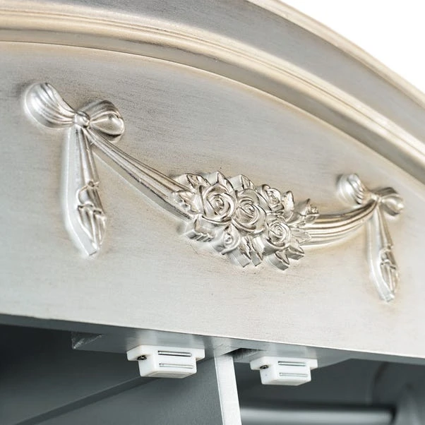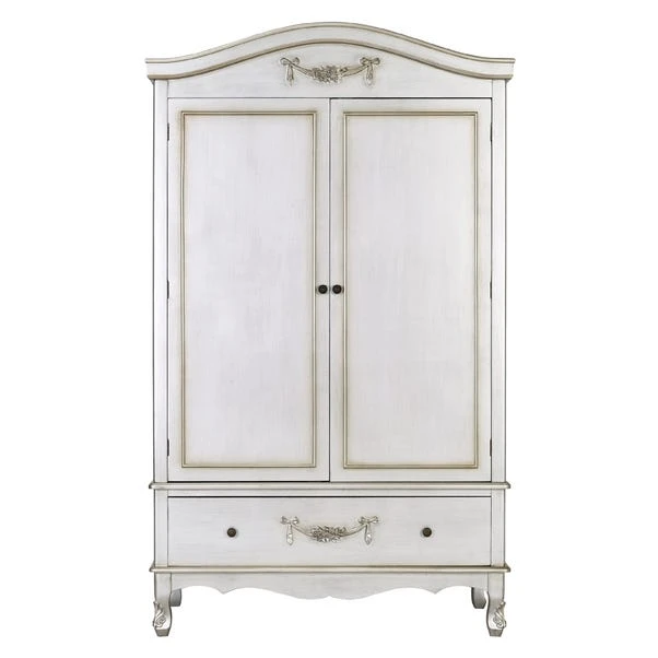 Featuring a French-inspired design with ornate floral detailing, the Toulouse range boasts a vintage look, with a choice of antique silver and distressed off-white finishes. Featuring curved legs, this self-assembly double wardrobe will add an elegant touch to any room.